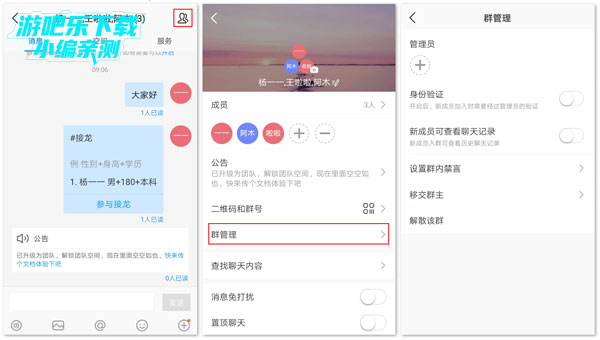 点击“群管理”,在群管理界面,可升级为团队、移交群主和解散群组。