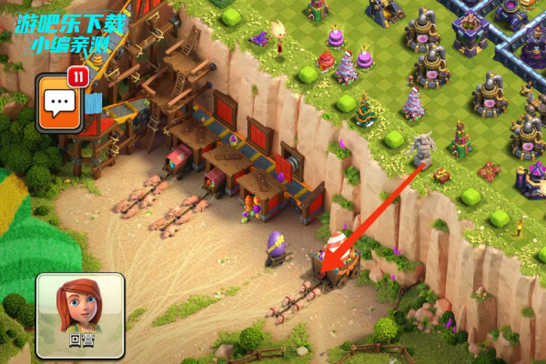 5、女王在拆炸弹塔的时候,就在下面的红色方框内下南瓜头野蛮人,10个左右就够,吸引x弩仇恨。这样可以进一步保证女王和女武神的状态良好。