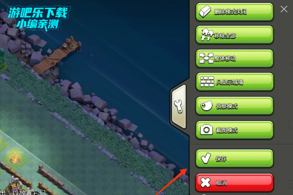 7、女王拆掉x弩后,在如图所示位置放超级蓝胖,超级蓝胖会先按蓝色箭头方向摧毁两个迫击炮,然后往红色箭头方向移动。