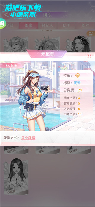 0氪玩家,前期可主“江澄”,副“沈慕宁”,后期有男女团,可换培养男女团成员(女团:袁菲琳,王子馨,男团:费希纳,诺峰)
