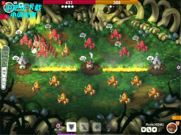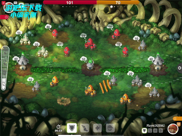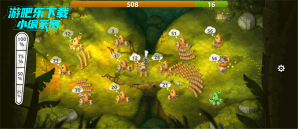 当首领拥有一定实力(人(菌)口)后,便可以调兵遣将向四周进行扩张。出征时,可以通过调节左侧的百分比进度条,选择不同建筑内想要派出的士兵数量比例(25%、50%、75、100%)