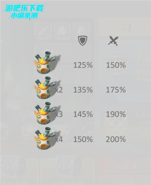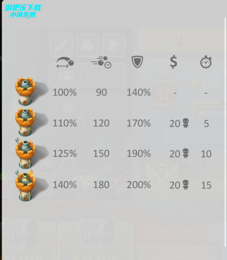 炮塔1升2射程增加百分之十,射速增加三十,防御增加百分之三十,