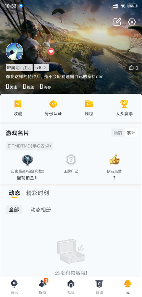 1、在手机上打开软件,进入可以看到拥有资讯、好友、社区、战绩以及我的五大板块