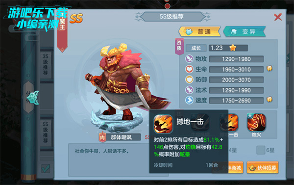 这是单独的一个,之所以推荐是因为它的天赋技能,带嘲讽带眩晕带带灼烧,万金油般的全能小伙伴。“牛魔吼啸”是控制技,“憾地一击”可对“灼烧”目标晕,且冷却回合只有1回合,牛魔王自身还带有被动技灼烧,尤其适合搭配带克制灼烧效果的铁扇公主和红孩儿。