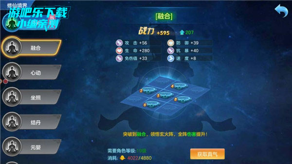 三、境界系统 ,开始的时候要达到一定境界,玩家才可以上阵多个英雄,而且境界可以为玩家增加战力,玩家可以用真气提升等级,真气获取也很多,门派比武,天命之塔,野外等等!