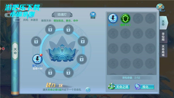 四、天命系统 ,天命就是像某些游戏的符文一样,镶嵌以后可以提高战力,而且还可以升级,天命也分等级,玩家可以在天命之塔获取,或者寻仙阁,天命商城!