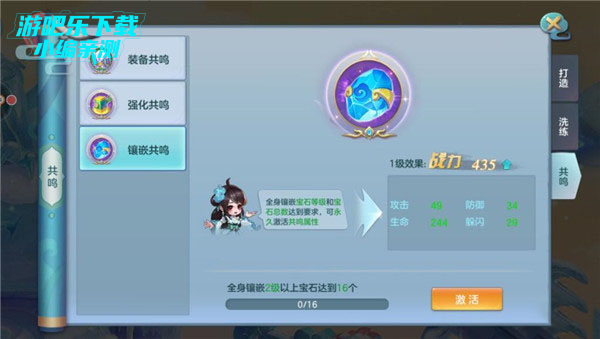 共鸣系统分为,装备共鸣,强化共鸣,镶嵌共鸣,大部分就是这些达到多少就可以共鸣开启属性加成!