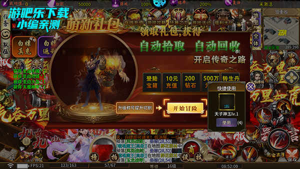 山河传奇手游上线即领 “八大福利”,含自动拾取、自动回收、自动分解及野蛮神技等核心功能,跟随主线任务 10 分钟即可解锁满级战士技能(烈火剑法、逐日剑法等),快速渡过前期发育阶段。