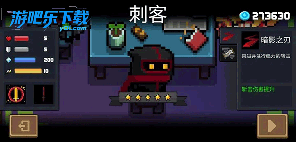 3.刺客,技能过程无敌,加速,击杀敌人刷新技能冷却,最多可使用五次(此处已更正)。技能无比变态被动近战反弹,前期清怪有很大优势。可调戏boss
