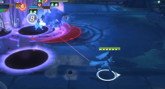 第二技能:宇文敌脚下出现红圈,然后随机点名玩家脚下出现红圈,需要连续位移躲避,一定不能贪刀。另外需要注意的是,玩家在走位时,有可能踩到别人屁股后面的圈圈,从而高伤暴毙。指挥可以提前提醒大家进行分散,以规避伤害。