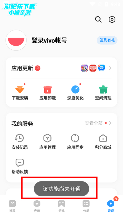 vivo应用商店会自动检测用户手机机型,如果不是vivo手机型号则不会让用户登录的,如下图红色方框所示,其它手机会被告知该功能尚未开通。