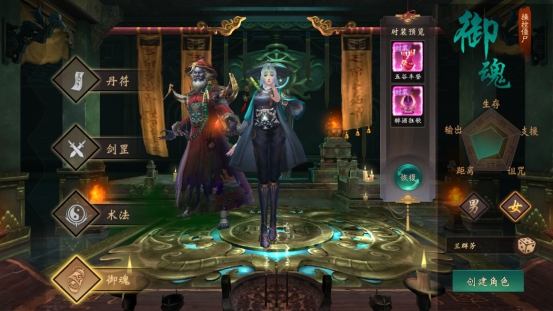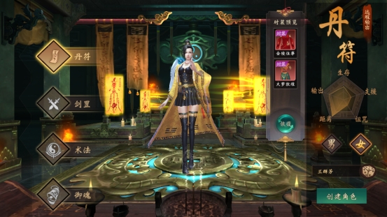 角色分别为:丹符(远程攻击类)、剑罡(近战输出类)、术法(远程支援类)、御魂(远程召唤类)