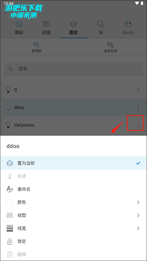 7、点击旁边的三个点还能够对该图层进行设置,其中包括:置为当前、重命名、颜色、线型、线宽以及锁定等操作。
