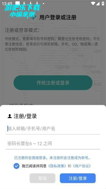 3、输入账号信息并填写密码后勾选同意协议,点击【注册/登录】即可登入
