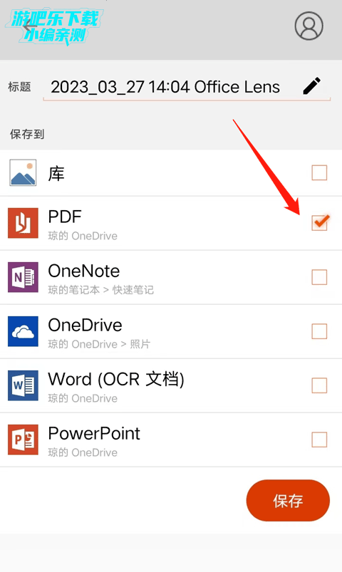 4、之后这里可以修改标题,可以选择保存到库、PDF、OneNote、Word(OCR文档)、OneDrive和PowerPoint,这是一个多选格式,你可以同时保存到多地,注意记得先点击右上角头像先登录。