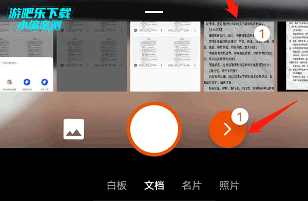 1、首先在该页面下载此应用软件,下载安装完之后点击进入,这里有白板、文档、名片和照片的选项,你可以根据你所需要扫描文件类型来选择,还可以点击左边图片logo在你的手机本地相册里选择你需要扫描的东西,选择完之后点击右下方的红色尖括号。