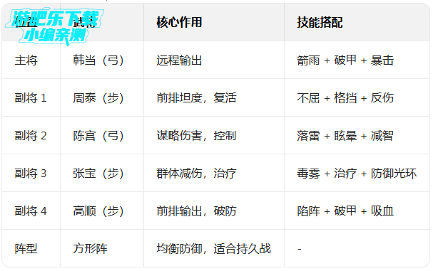 A:可用韩当(紫卡)替代,技能搭配箭雨 + 破甲 + 暴击,虽然伤害低一些,但配合副将减伤和控制,也能通关。