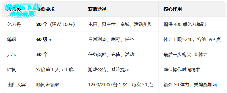 卡体力的本质是体力丹 + 出师大宴 + 元宝购买的精准叠加,利用双倍经验放大收益: