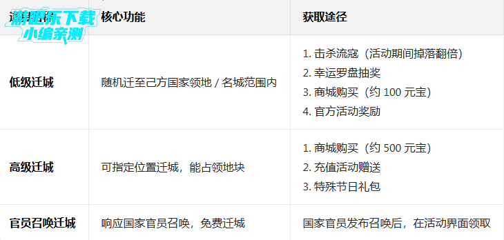 一、迁城道具类型与获取方式