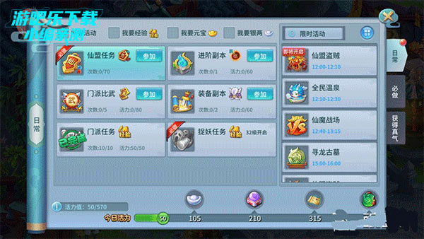 在日常活动中可以查看当前正在进行的活动以及必做任务、获得真气的途径。