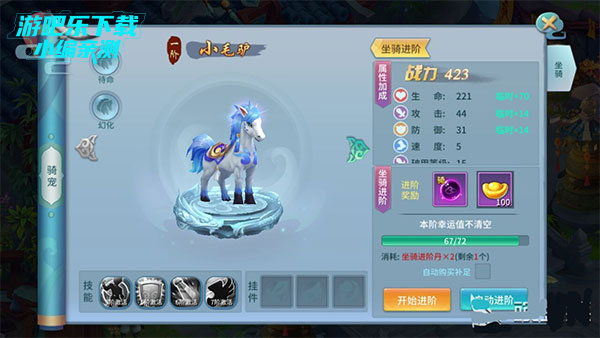 坐骑界面中,可以查看坐骑进阶需要用的材料,点击相应材料还能够查看获得途径。