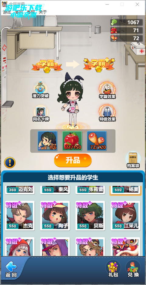 学生升品是在保健室内完成的,在保健室里我们可以清楚地了解每种资源的具体价值。在保健室右下角的“兑换”处可得知1水果=8蔬菜,1鸡腿=8水果。在卡牌分解的时候,可得知1普通卡=8蔬菜,1优秀卡=8水果,1精英卡=8鸡腿。