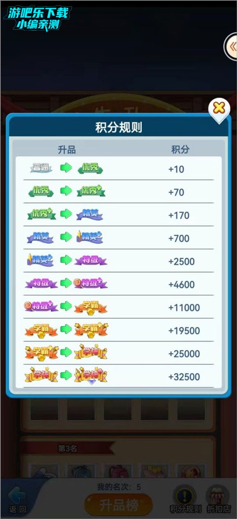 9、升级升品一个主力学生,科目全开,可以加不少分数。一般从1级到四五百级估计二三十万分吧。这一项是主要的加分项,平时一定要多攒心得和心得表。