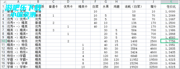 因此,在升品过程中,蔬菜为最小单位,对于补品食材来讲1水果=8蔬菜,1鸡腿=64蔬菜。而对于学生卡来讲,1普通卡=8蔬菜,1优秀卡=64蔬菜,1精英卡=512蔬菜。