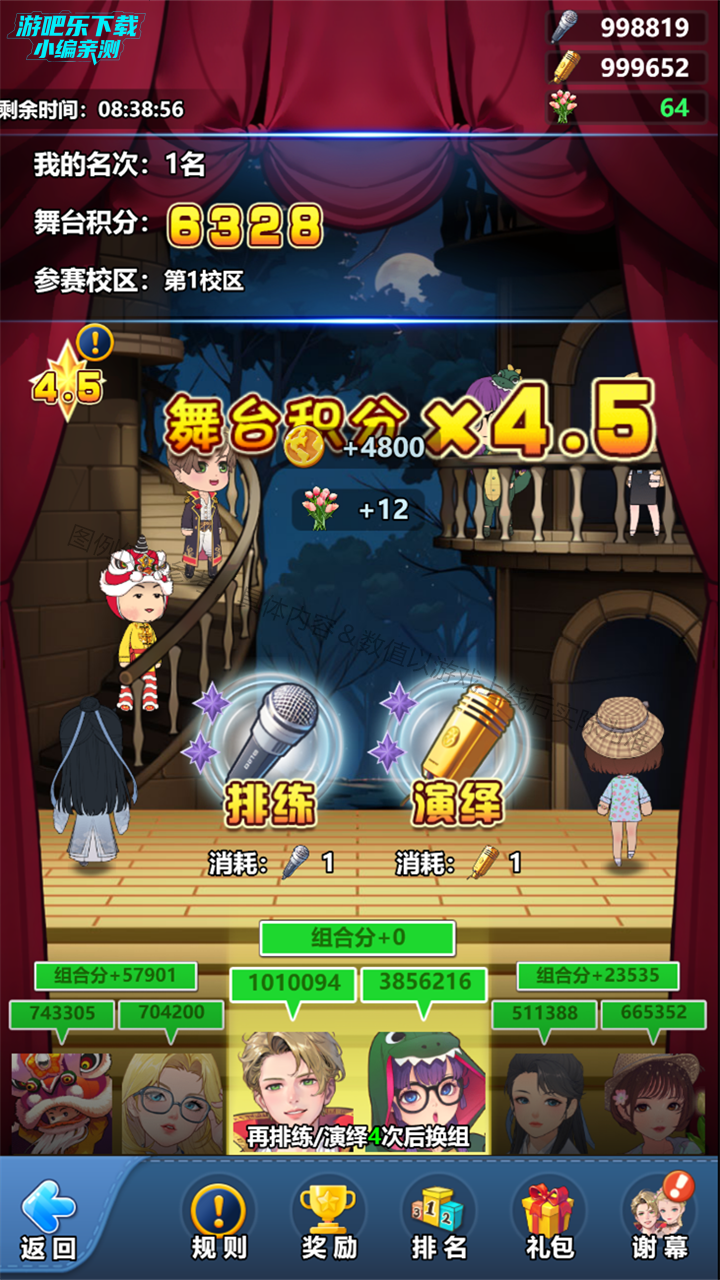 1) 排练:每次排练需消耗“银话筒”,可获得一定数量的比赛积分、世界币和“花束”;