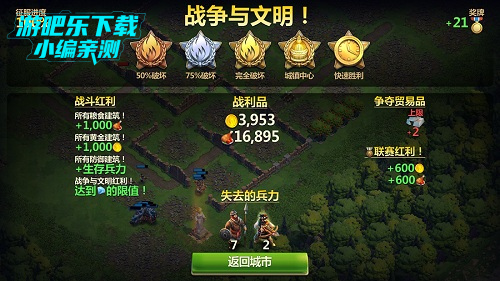 战斗的兵种的选择可根据每次的作战目的进行自由搭配。对于掠夺资源可以骑兵突击队为主要兵种,而面对防御建筑多的敌对文明则需要更多的骑马兵,获取全胜红利奖励则需要各类兵种合理搭配,且对于战斗需要策略的进行布局。