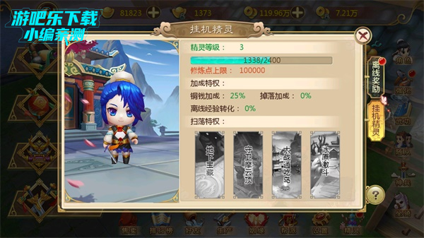 除了角色可以获取经验之外,挂机精灵的经验也会增长。当挂机精灵升级时,玩家可以获取更多“扫荡特权”,可以使用扫荡券扫荡之前无法扫荡的试炼副本。也会在之后的离线挂机中获得更高的铜钱、掉落和经验加成!