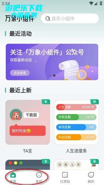 打开万象小组件后,在底部的导航条点击“首页”或“发现”,里面都有很多小组件;